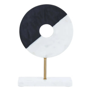 Expertly handcrafted, this sculpture has a decorative disc appearance mounted on a sleek rectangular stand. The rounded disc comes in an elegant two tonal black and white contrast which combine with gold tone inlay detail to make a statement.